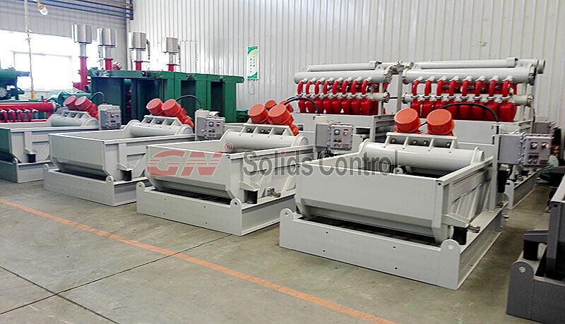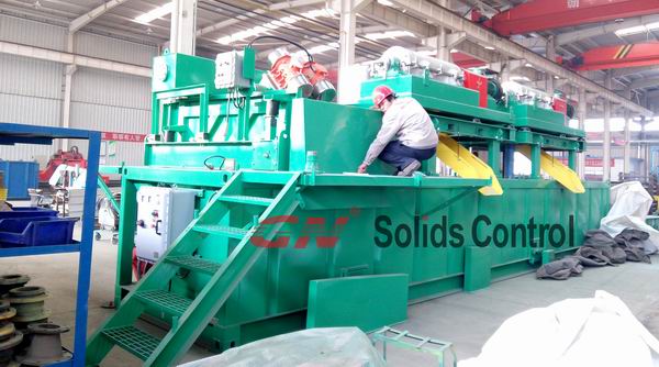 500gpm泥漿系統(tǒng)包括以下項(xiàng)目: 1)一臺500gpm處理量的鉆井液振動篩:GNZS703E-DZ。該振動篩采用箱式供料,方便水井鉆機(jī)工作,3片篩網(wǎng)都采用加楔塊式安裝裝置,便于篩網(wǎng)快速更換。 2)一臺500gpm處理量的泥漿清潔器:GNZJ703E-1S8N。該款泥漿清潔器同樣采用GNZS703E-DZ振動篩,3片篩網(wǎng)都采用楔塊式安裝裝置,便于篩網(wǎng)快速更換;篩箱底框采用不銹鋼材質(zhì)延長使用壽命。 3)一臺泥漿攪拌器。泥漿攪拌器安裝在干凈泥漿儲漿罐中,在添加化學(xué)添加劑后起到懸浮泥漿和混合泥漿的作用。 4)一臺雙離心泵的射流混漿裝置。一個泵從泥漿罐到料斗起到循環(huán)泥漿的作用,混合添加化學(xué)物質(zhì),另一個將泥漿泵到鉆井平臺。與此同時,國內(nèi)客戶的兩套用于HDD非開挖項(xiàng)目的1500gpm的泥漿系統(tǒng)也準(zhǔn)備交付。
