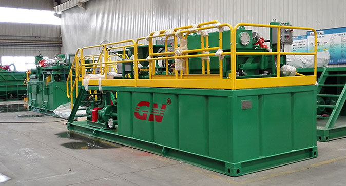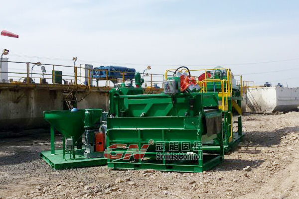 本套系統(tǒng)分為2個(gè)階段的固控處理和一套泥漿配置混合系統(tǒng)。鉆井泥漿初步分離采用的是冠能GNZS752型振動(dòng)篩,200GPM的處理能力、兩片篩網(wǎng)的構(gòu)造用來處理鉆井泥漿中的大顆粒的固體。振動(dòng)篩處理后的液體通過離心泵輸送給迷你型的沉降離心機(jī)GNLW223進(jìn)一步處理,可達(dá)3800RPM的轉(zhuǎn)速,分離的固體顆??蛇_(dá)到2個(gè)微米。