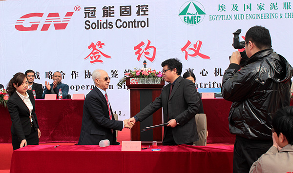 2015年3月12日,冠能固控與埃及國家泥服公司在中國北京冠能公司總部簽署戰(zhàn)略合作協(xié)議,為此冠能固控舉辦了盛大了簽約儀式,儀式也包括了一大批離心機的成功交付。